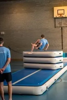 The AirBox can be used as a methodical and inflatable vaulting box. When a gymnast or student hits a knee with an activity such as “squat on” or the “round off” over the vaulting box, their confidence takes a hit too. In the case of the AirBox, the student can keep going without feeling frustrated and will reach the goal faster. The soft and bouncy AirBox will make vaulting exercises a lot more fun!